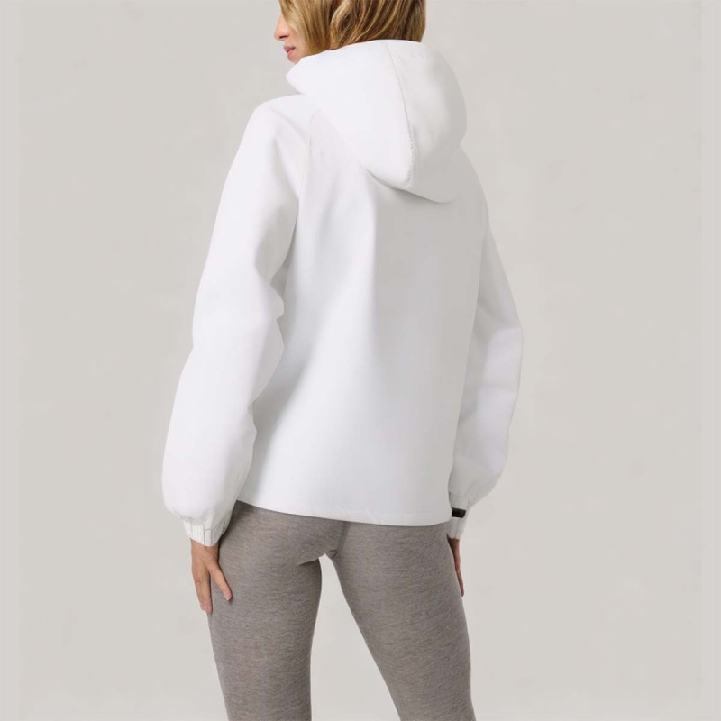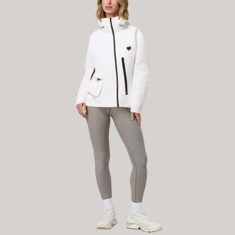 This women's windbreaker features a stylish slanted zipper closure, combining individuality and functionality. The hooded design offers versatility in changing weather, providing extra protection. Adjustable Velcro cuffs effectively block cold wind and enhance warmth. Two zippered pockets are secure and practical, conveniently storing personal items. An elasticated hem allows for adjustable fit, improving overall protection. The lightweight and durable fabric combined with a comfortable cut makes it ideal for outdoor activities and everyday wear.