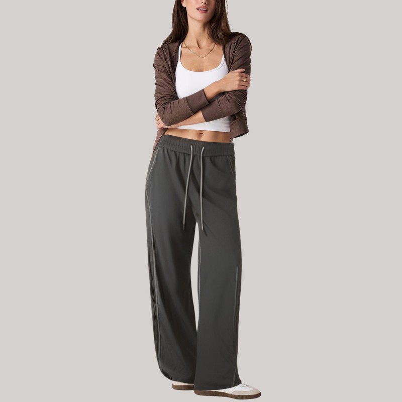 These women's windproof pants feature a simple and clean striped design, showcasing a sporty and casual style that combines practicality and fashion. The elastic waistband with drawstring allows for easy adjustment to fit different body types. Practical pockets on both sides provide convenient storage for small items. The straight-leg cut flatters the leg line, offering comfortable wear and making them suitable for both outdoor activities and everyday outings, exuding a chic yet relaxed charm.