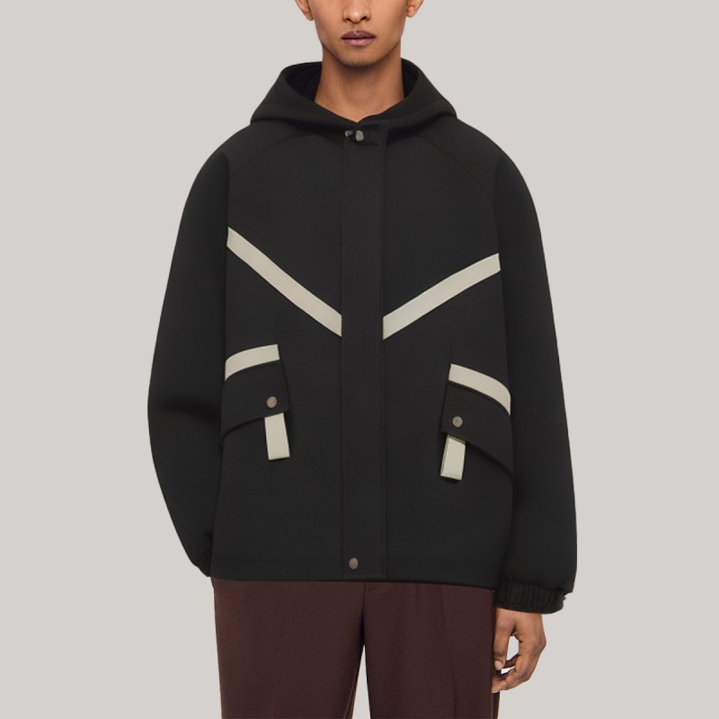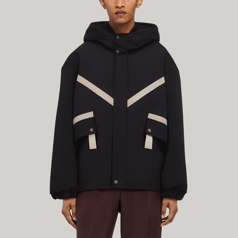 This men's windbreaker features a stylish contrasting stripe design while remaining practical and comfortable. The hooded design provides effective wind protection and warmth, and the Velcro cuffs offer adjustable fit for enhanced protection. Simple and practical side pockets provide convenient storage for personal items. An elasticated hem allows for adjustable fit and improved warmth. The overall relaxed fit is suitable for various outdoor activities and everyday wear.