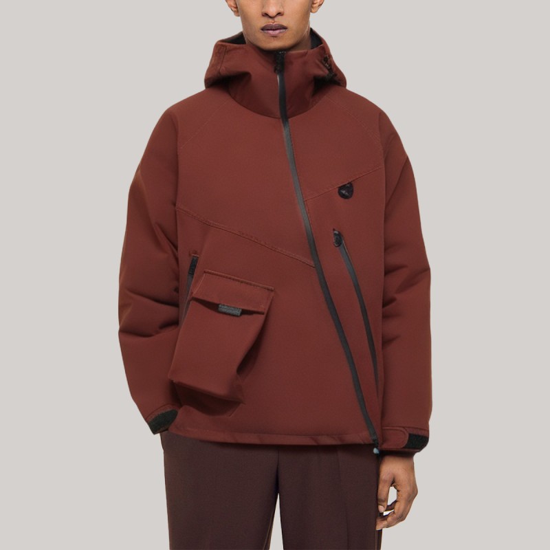 This men's windbreaker is designed for outdoor activities and everyday wear, combining functionality and style. The hooded design provides all-around protection, while the unique slanted zipper makes it easy to put on and take off while enhancing its design. Adjustable Velcro cuffs offer excellent wind protection. Two zippered pockets provide convenient and secure storage for personal items. An elasticated hem allows for adjustable fit and enhanced warmth. The overall fit is comfortable and relaxed, allowing for freedom of movement.