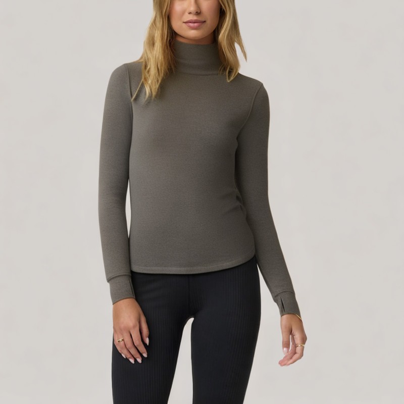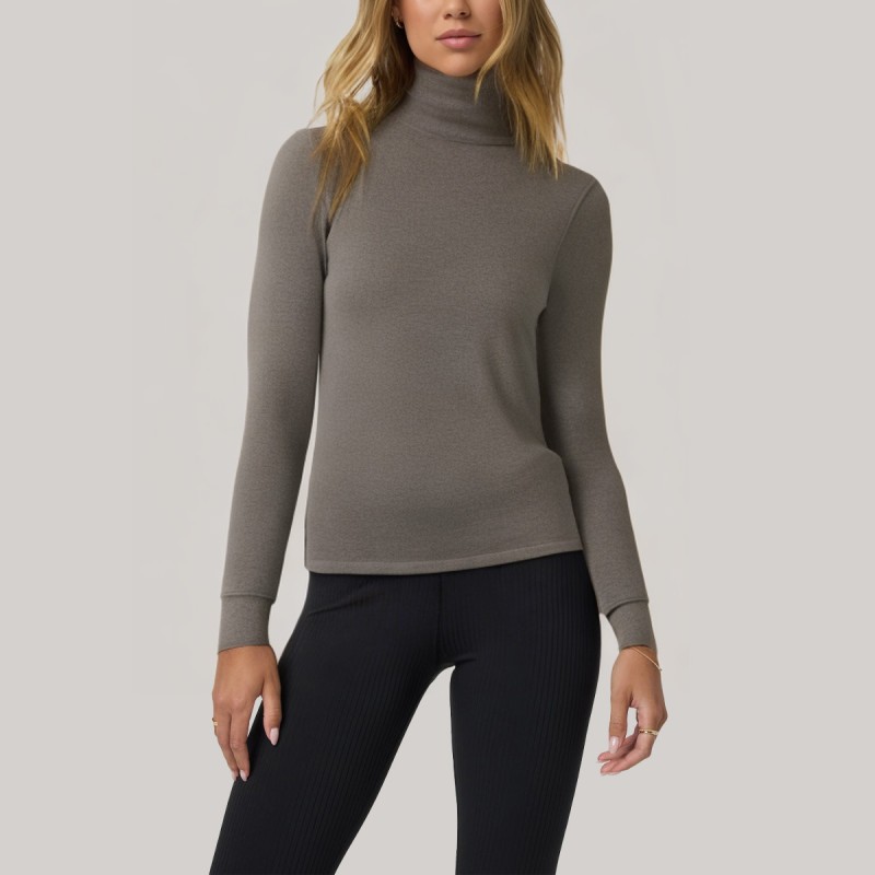 This women's turtleneck base layer, with its simple yet practical design, is a versatile staple in any autumn/winter wardrobe. The turtleneck conforms to the neckline, providing soft warmth, while the long sleeves with thumbhole details add a touch of style and practicality. The soft, delicate knit fabric is comfortable and not constricting against the skin. It can be worn alone for a minimalist look or layered under sweaters, coats, or dresses to easily handle changeable weather.