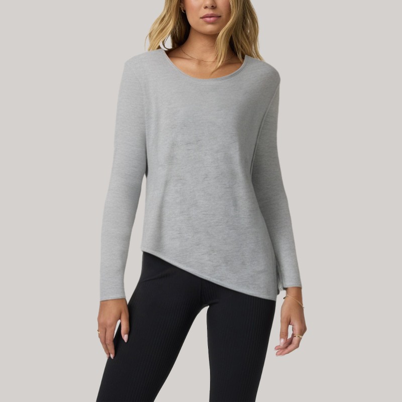 This women's base layer top features a simple, solid-color design that exudes minimalist beauty. The round neckline gently hugs the neck, adding an elegant touch. The long sleeves offer both comfort and practicality, allowing it to be worn alone or layered under outerwear or knitwear. The asymmetrical hem is the highlight, breaking away from traditional balance and creating a unique, fashionable layered look that adds a dynamic charm to everyday styling. The overall fit is comfortable and natural, flattering the figure while maintaining a casual style, suitable for various occasions.