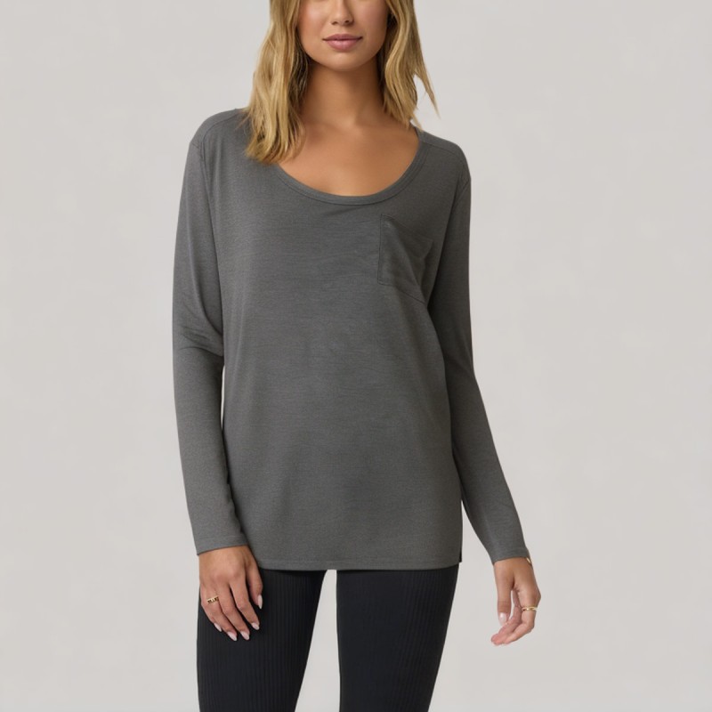This women's base layer top features a simple, solid color design, showcasing a low-key yet elegant everyday style. The classic round neckline beautifully accentuates the neck, flatters the face, and enhances overall elegance. A decorative chest pocket adds a subtle detail, making the overall look more layered and stylish. The long sleeves balance practicality and comfort, suitable for wearing alone or layering under a jacket, easily adaptable to various occasions. The lightweight, soft fabric has a delicate feel, providing a comfortable wearing experience.
