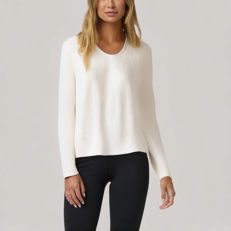 This women's base layer top features a solid color design with delicate jacquard details, creating a low-key yet stylish everyday look. The round neck design gently hugs the neckline, highlighting feminine elegance. The long sleeves are comfortable and practical, suitable for wearing alone or as an inner layer. The straight hem design is clean and crisp, creating a simple and smooth overall silhouette. The jacquard texture adds visual depth and detail, making the classic style more unique and refined. The fabric is lightweight, smooth, and soft to the touch, providing a comfortable and natural feel.