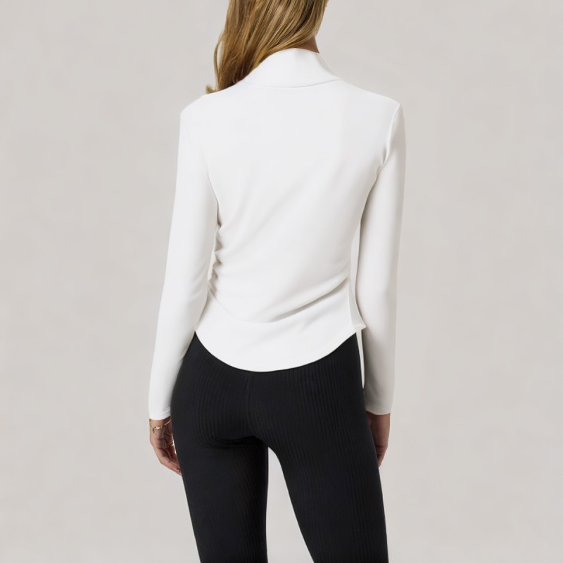 This women's base layer top features a solid color design, showcasing a simple and elegant everyday style. The high neck design provides warmth and comfort around the neck, while adding a touch of sophistication and style. The long sleeves are comfortable and practical, suitable for multiple seasons. Side pleats cleverly add layering, highlighting the details and enhancing the overall slimming effect. The naturally flowing curved hem makes the overall silhouette lighter and more dynamic. The soft, smooth fabric is comfortable against the skin, easily creating versatile looks whether worn alone or layered.