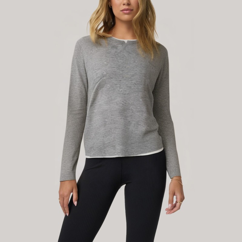 This women's base layer top features a contrasting color-blocked neckline, adding a stylish touch to the simple round neck and showcasing vitality and personality. The round neck cut is soft and natural, flattering the neckline and highlighting an elegant temperament. The long sleeves are comfortable and warm, perfect for autumn and winter wear. The straight hem is clean and crisp, creating a simple and sophisticated overall silhouette. The soft and skin-friendly fabric is lightweight and stretchy, ensuring comfortable wear and effortless style. Whether worn alone or layered under a coat, it easily creates a versatile look.